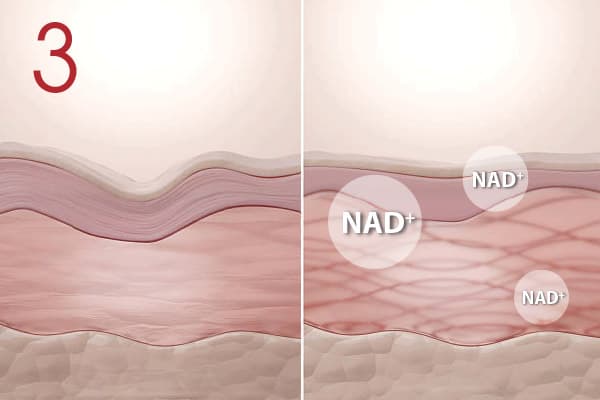 By restoring NAD+ levels, the skin benefits from improved cell regeneration, enhanced collagen synthesis, reduced oxidative stress, and a visible reduction in signs of aging
