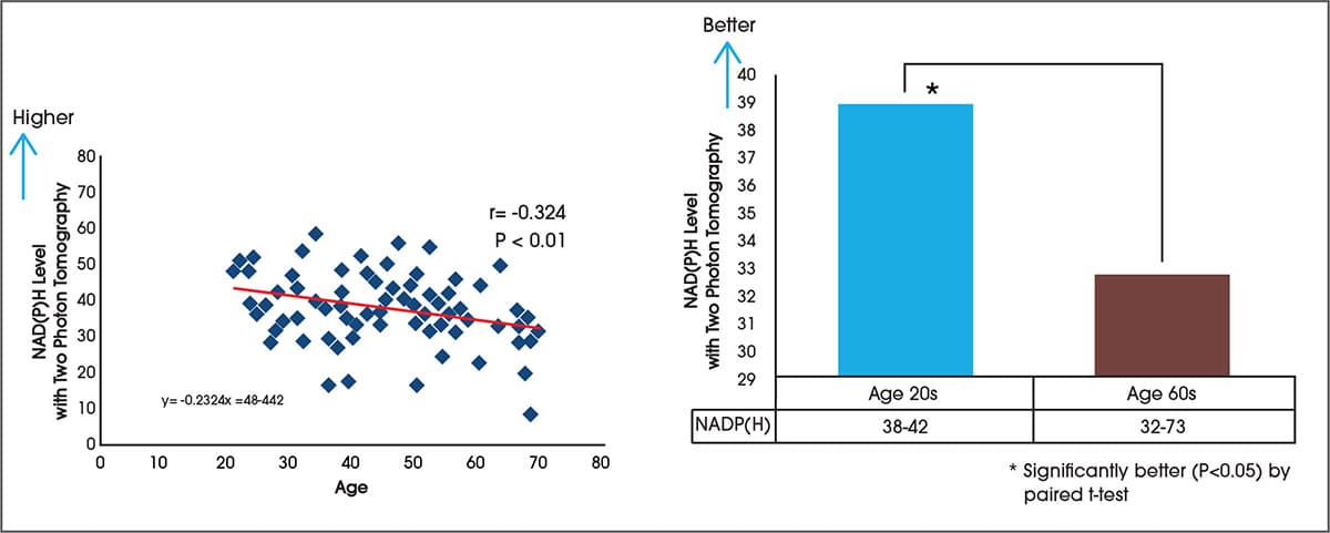 Autofluorescence of NAD(P)H grey scale level in granular cells in the facial skin by age (left) and mean NAD(P)H levels in the 20s age group and the 60s age group (right). There is significant correlation between NAD(P)H level and age, and the NAD(P)H level in the facial skin of the 20s age group is significantly higher than that of the 60s age group.